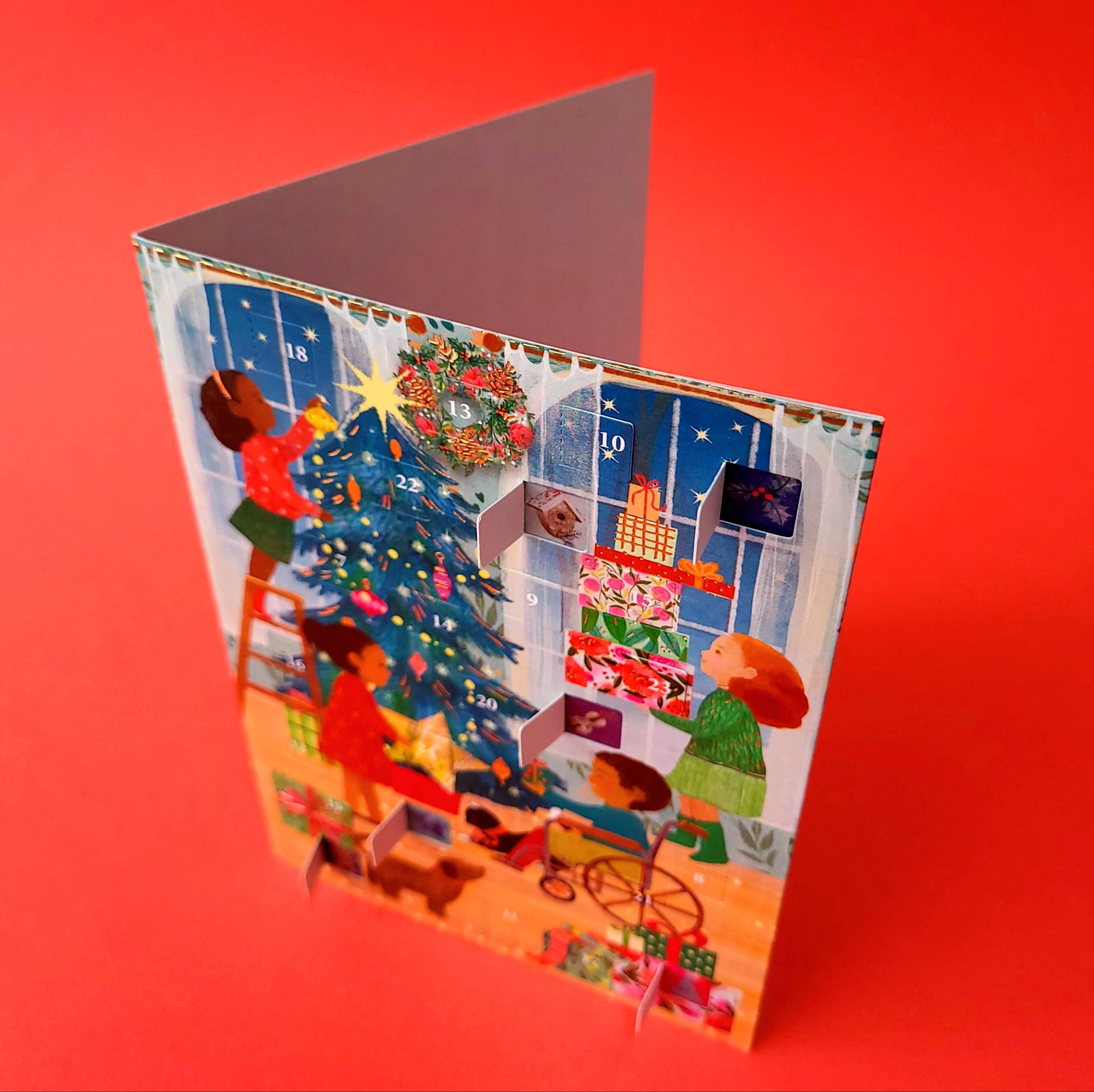 Our Advent Calendar Cards are a charming hybrid between Christmas Card and Advent Calendar – and are a delight to receive! The same size as our standard cards, these gorgeously gold-foiled festive calendars include 24 die-cut windows revealing adorable illustrations. Simply write your message inside the card, pop them in an envelope, and post! This Card features cute children enjoying a Christmas decorating Tree party, artwork by Kendra Binney.