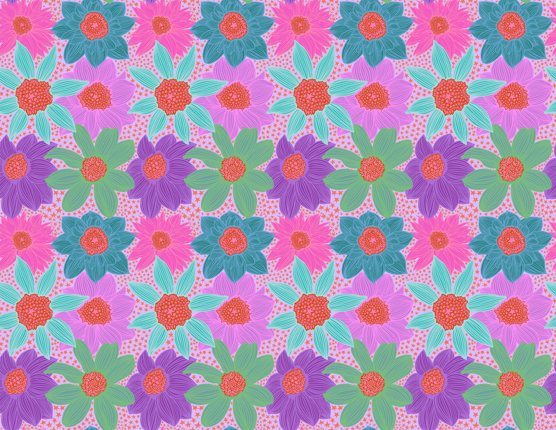 Jumpstart is a playful and quirky celebration of Anna Maria's first adventure in growing flowers from seed. Witness vibrant and gorgeous blooms of Zinnias, Silene, Bells of Ireland, and Celosia coming together in a bouquet of prints that pay tribute to the surprising diversity in her Dahlias. See the Stars & Stripes Print highlighting the unique center and petal details.