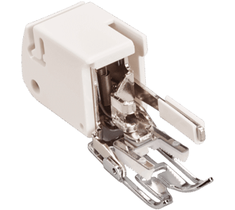 Difficult-to-work-with fabrics are best sewn using the Walking foot. It supports the fabric feed by a second feed dog on the upper side of the foot. The sewing project is moved simultaneously by the two feed dogs which allow a smooth sewing process.