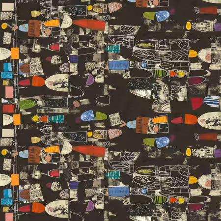 This fabric features a vibrant and eclectic design, showcasing a collage of abstract shapes and patterns in a variety of colors against a dark background. The design includes elements that resemble timelines, maps, and various geometric forms, creating a visually stimulating and artistic look. Ideal for both fashion and home decor projects, this knit fabric offers a unique aesthetic that can add a modern touch to any creation.