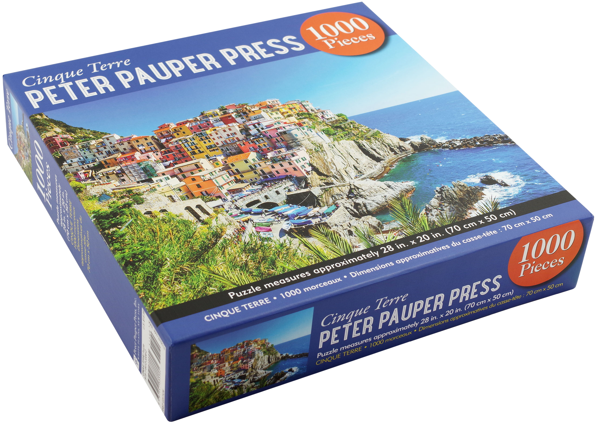 Escape to the sun-soaked Italian Riviera and be challenged by our Cinque Terre Jigsaw Puzzle ! 1000 precision-cut pieces fit snugly. High-resolution image. Linen-textured surface reduces glare. Durable premium blue puzzle board. Full-sized, full-color poster of finished puzzle included for reference. Hours of fun! Finished puzzle measures 28'' wide x 20'' high. Sturdy puzzle box measures 9-1/4'' square x 2'' deep. Warning: Choking hazard, small parts. Not for children under 3 years.