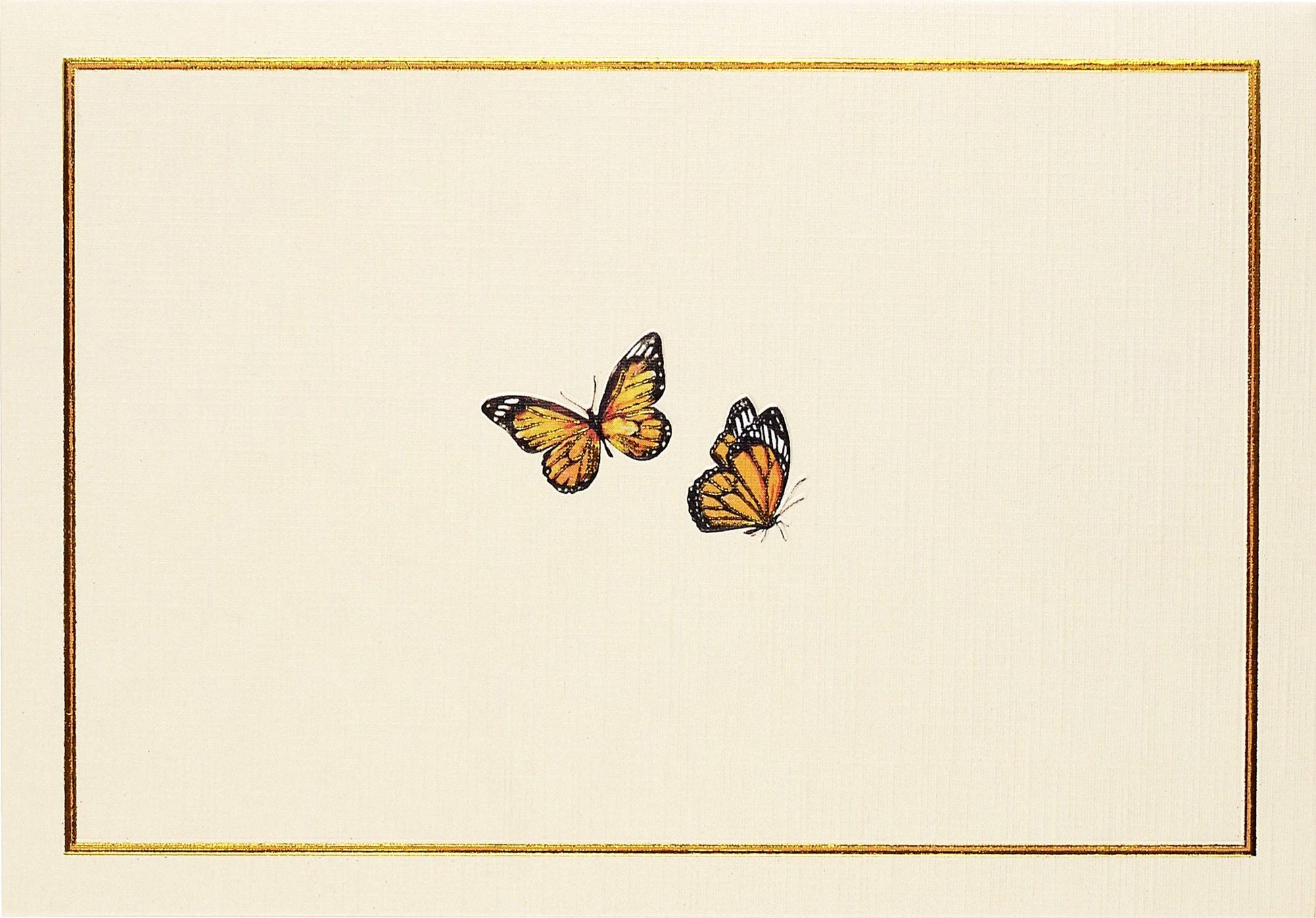 Elegant note cards depict a pair of monarch butterflies in flight. Premium boxed stationery set comes with 14 note cards and 15 envelopes. Card interiors are blank for your personal messages. Uncoated card stock takes pen beautifully. Card exteriors feature a unique linen-like finish. Design is embellished with and framed in gold foil. Embossing lends dimensional detail. Matching stationery envelopes complete the set. Cards are suitable for a variety of occasions. Beautiful note cards are a pleasure to use and to receive! Cards measure 5'' wide x 3-1/2'' high.