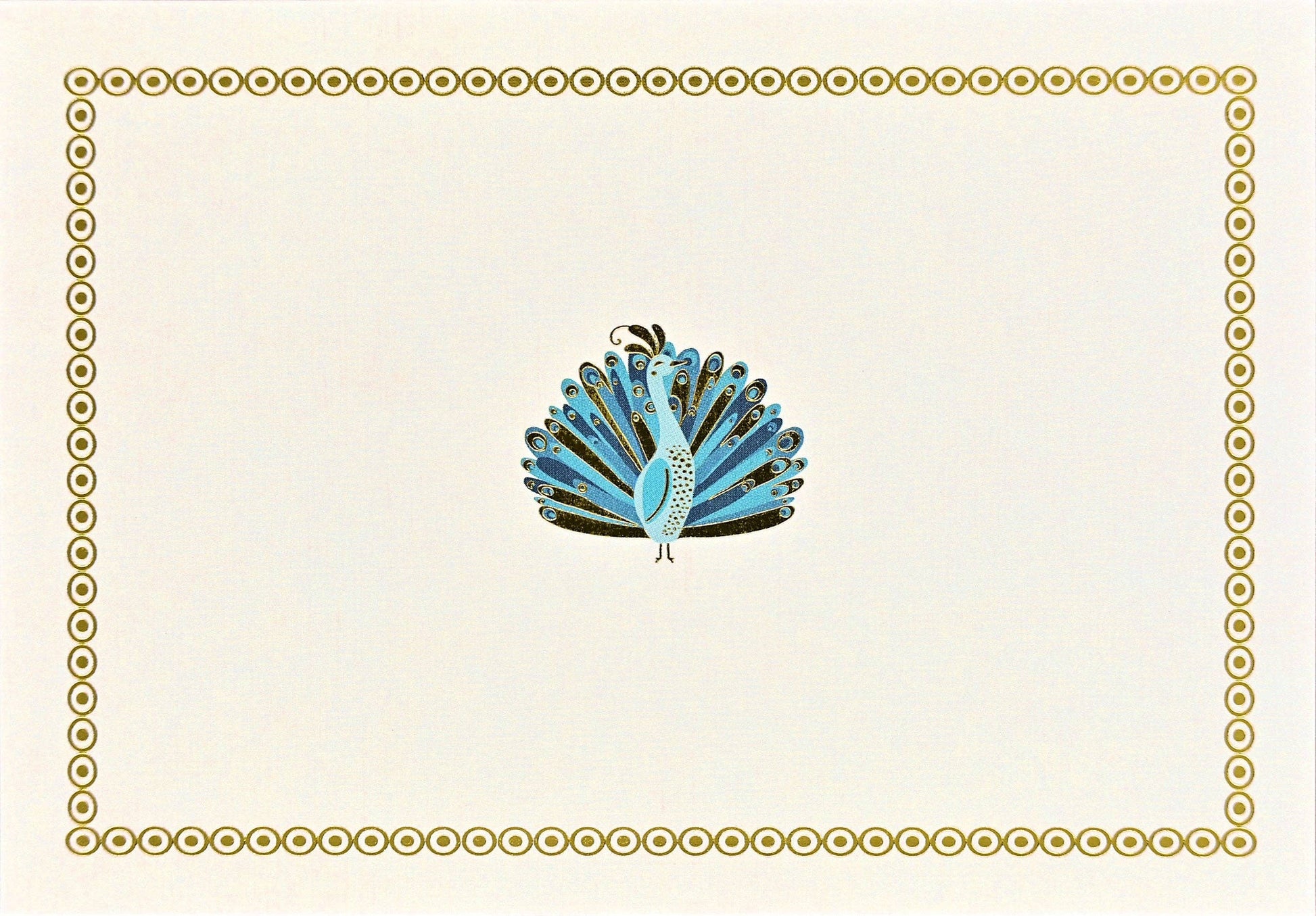 A jewel-like peacock design, set off with a decorative gold foil border, is the focus of these elegant note cards. Premium boxed stationery set comes with 14 note cards and 15 envelopes. Card interiors are blank for your personal messages. Uncoated card stock takes pen beautifully. Our peacock design is embellished with gold foil. Matching stationery envelopes complete the set. Cards are suitable for a variety of occasions. Beautiful note cards are a pleasure to use and to receive! Cards measure 5'' wide x 3-1/2'' high.