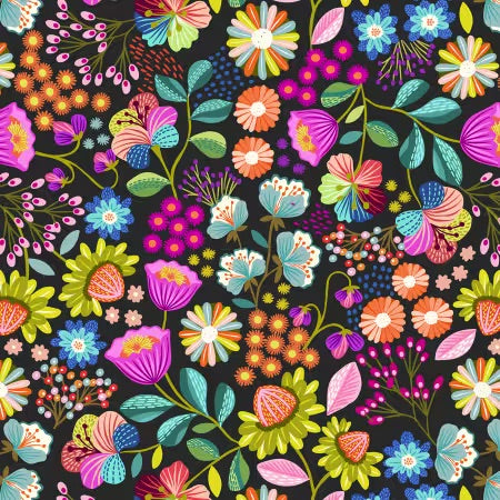 This vibrant fabric features an enchanting array of colorful flowers set against a deep black background, creating a striking contrast that brings each bloom to life. The design showcases a variety of floral shapes and sizes, with intricate details that include delicate leaves and playful splashes of color, making it perfect for a wide range of creative projects from fashion to home decor.