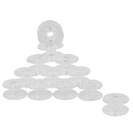 This set of 12 Class 15J transparent plastic bobbins is for use in SINGER Futura Embroidery Machines series 2600s, 3900s, 7400s, 8700s and Izek 1500 sewing machines. The bobbins come in a plastic storage box, which is reusable and easy to store. Consult your sewing machine's manual to ensure correct bobbin size. Use the transparent bobbins beneath the needle plate in automatic sewing machines to wind the thread for your embroidery projects. Never add thread to a partially wound bobbin, as it may be uneven and cause thread to tangle or break.