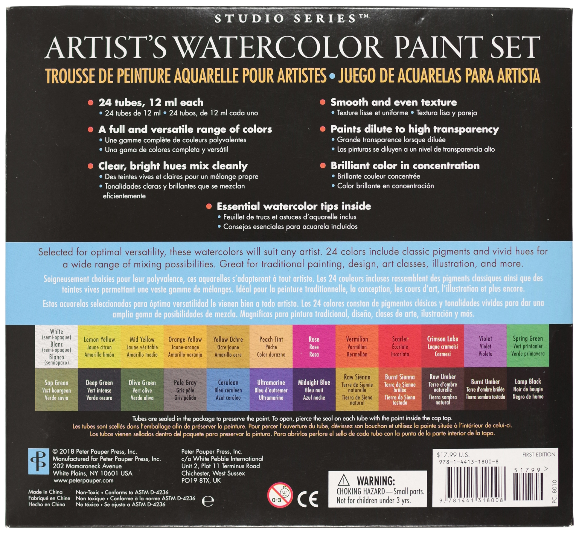 Selected for optimal versatility, these watercolor tubes will suit artists from beginners to pros. 24 colors include classic pigments and vivid hues for a wide range of mixing possibilities. Great for traditional painting, design, art classes, illustration, watercolor lettering, and more. 24 tubes, 12 ml each. A full and versatile range of colors. Clear, bright hues mix cleanly. Smooth and even texture. Paints dilute to high transparency. Brilliant color in concentration. Essential watercolor tips inside. Box measures 8-7/8'' wide x 8-3/16'' tall x 5/8'' deep.
