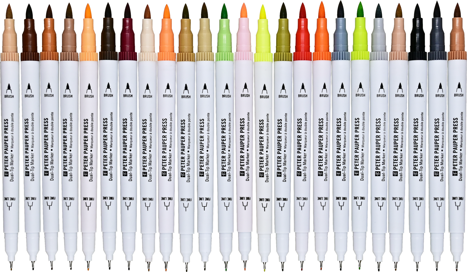 Premium Skin Tone Dual-Tip Markers markers are ideal for illustration, portraits, comics, and more! • 24 beautiful skin tone hues! A versatile range for a variety of art projects! • Each marker has 2 tips: Fine (0.4 mm), for intricate detail work and underlining; and Brush , for broad area coverage and highlighting. • Acid-free, water-based ink is fast drying and fade-resistant. • Perfect color selection! • Dual-tip markers come in a stylish cylindrical-shaped storage tube that safeguards your set when not in use. • Ideal for travel, art classes, and creativity on the go! • Set is also perfectly suitable for gift-giving! • Each marker measures 6-1/4'' long. • Card stock storage tube measures 7-1/2'' high x 2-1/2'' in diameter. • Clear acetate lid.