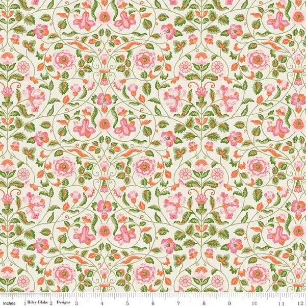 Discovered as a hand-painted artwork in the Liberty archive, this majestic botanical was reinterpreted as a delicately embroidered tapestry. Its ornamental ogee trail follows a characteristic Arts & Crafts mirrored repeat, adorned with a plethora of stylized roses, sunflowers, daisies, lilies, and honeysuckle.